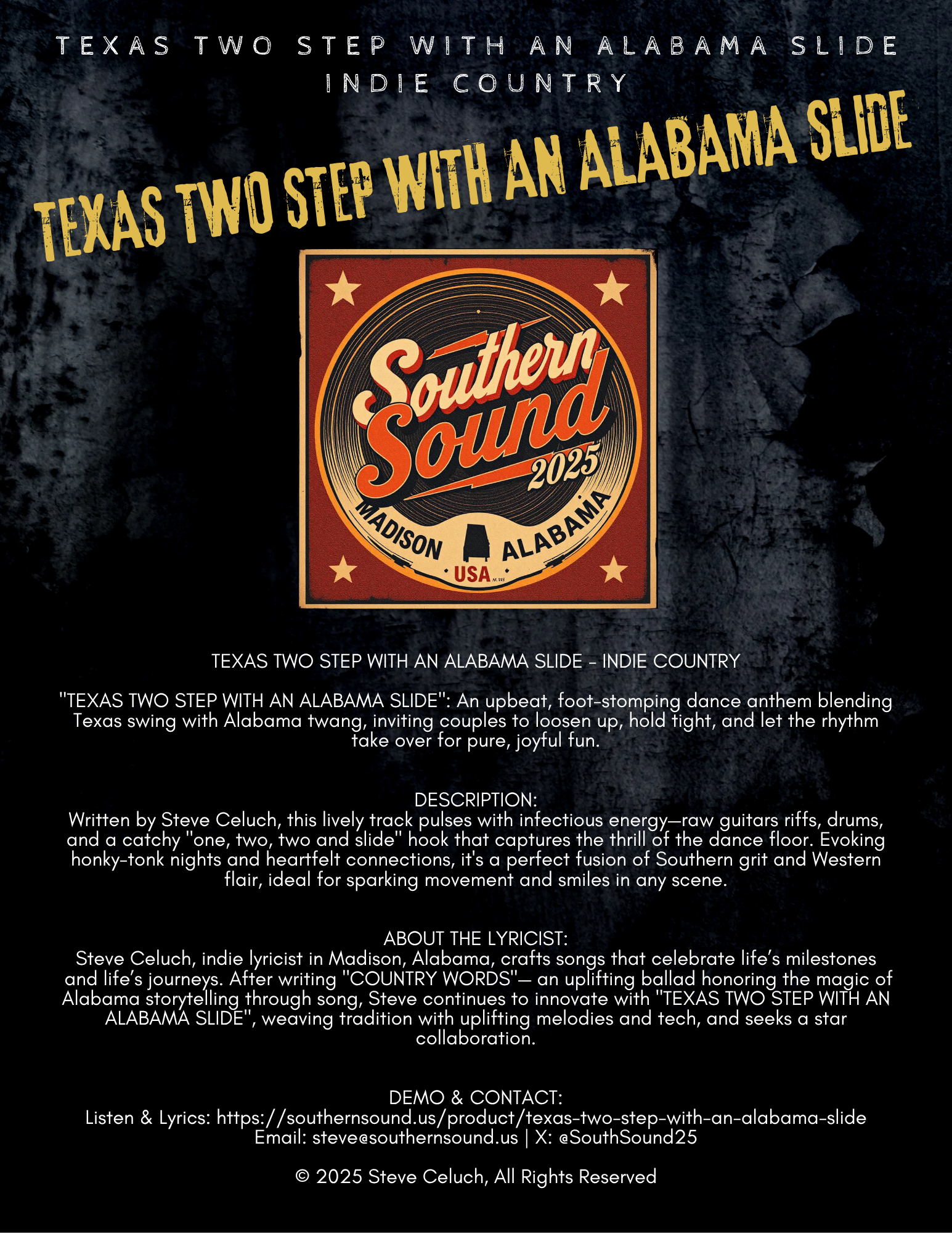 Discover SouthernSound 2025 – twenty four original written country songs, crafted for TV, film, commercials, and events. From high-energy anthems to heartfelt ballads, all songs are registered with BMI and ready for sync licensing.