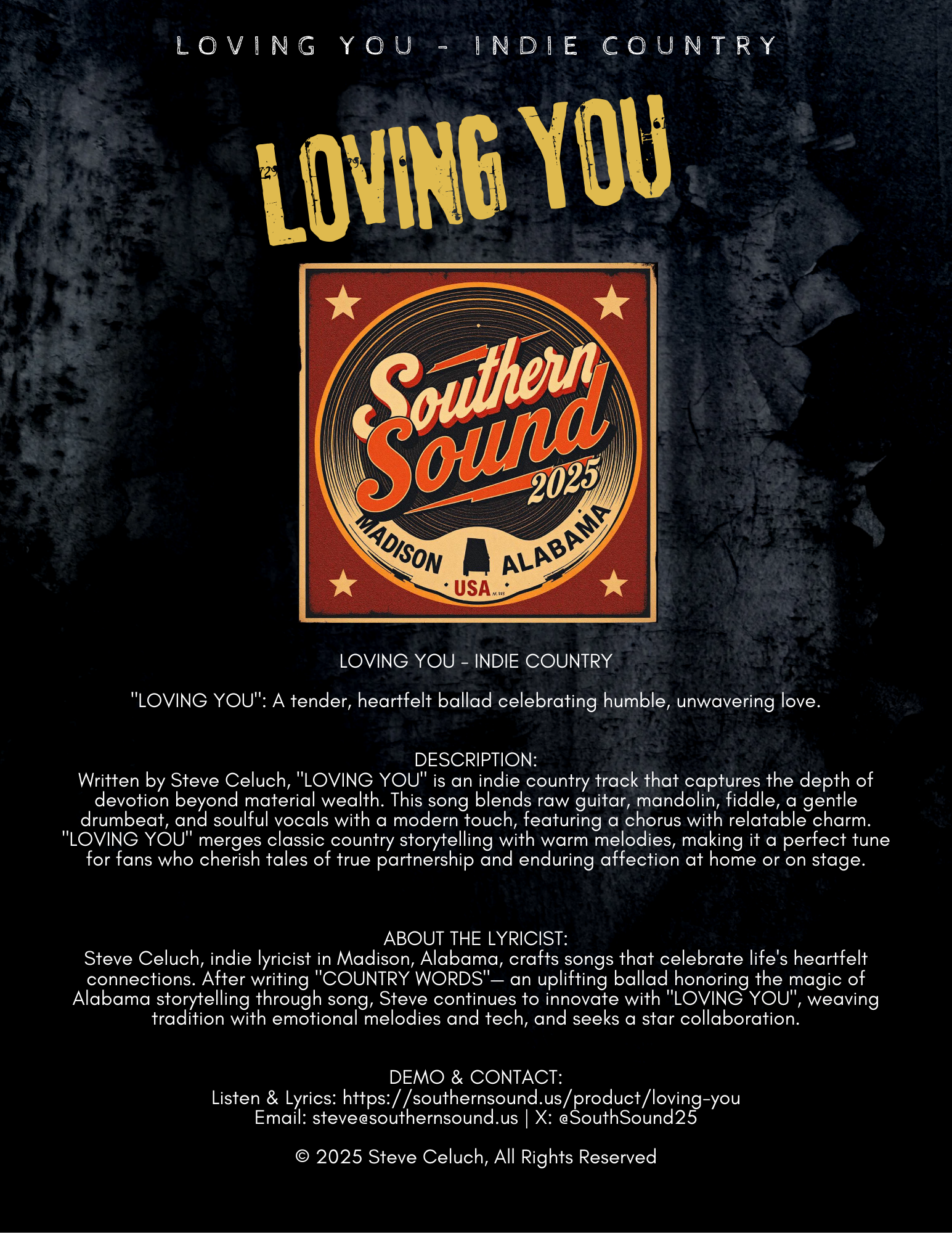 Discover SouthernSound 2025 – with twenty six original written country songs, ready for TV, film, commercials, and events. From high-energy anthems to heartfelt ballads, all songs are registered with BMI and ready for sync licensing.